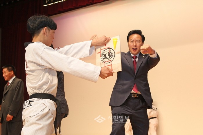 최근 조동탁 서울 강동구의장은 강동구민회관 대강당에서 열린 '제18회 강동구청장기 생활체육 태권도대회'에 참석해 생활체육 활성화와 태권도연합회 발전에 기여한 유공자에게 감사장을 수여했다. 사진은 조 의장이 격파 시범을 보이는 모습.(사진제공=강동구의회)