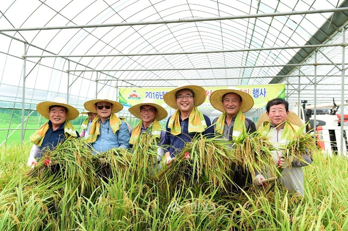 지난 11일 경기 여주시는 우만동 농가에서 '대왕님표 여주쌀 첫 벼베기 행사'를 실시했다. 사진은 벼베기 행사에 참석한 원경희 시장(오른쪽에서 세 번째)과 관계자들이 벼이삭을 들고 기념촬영하는 모습.(사진제공=여주시청)