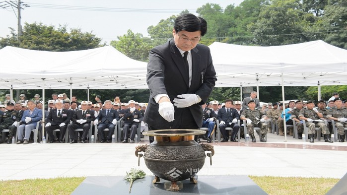 지난 11일 세종시는 전동면 소재 개미고개 '자유 평화의 빛' 위령비 앞에서 '제11회 개미고개 6.25 격전지 추모제'를 개최했다. 사진은 이춘희 시장이 분향을 하고 있는 모습.(사진제공=세종시청)