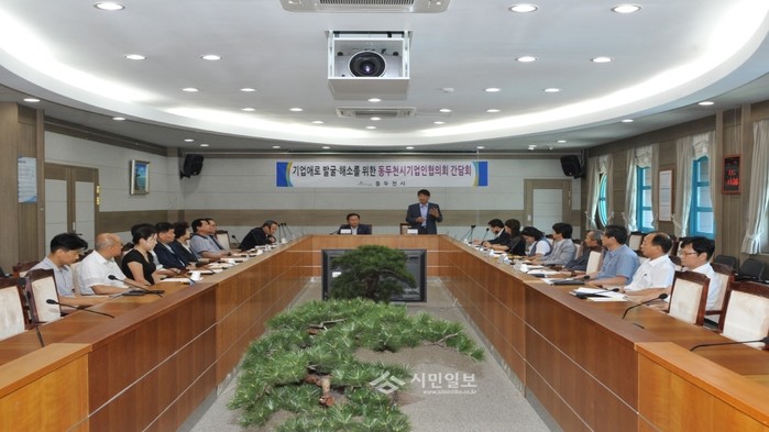 지난 11일 경기 동두천시 시청 상황실에서 열린 ‘기업애로 발굴·해소를 위한 기업인협의회 간담회’에서 지역내 기업인 대표와 시 관계공무원들이 기업과 근로자가 상생할 수 있는 방안 등에대해 토론하고 있다.(사진제공=동두천시청)