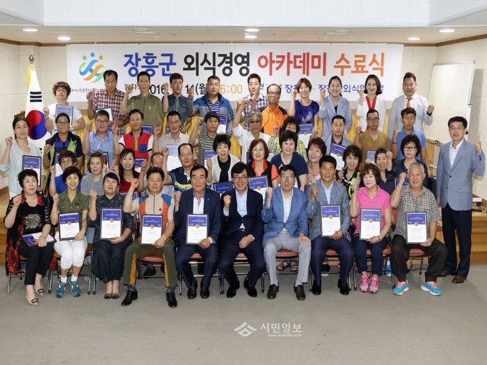 지난 11일 전남 장흥군은 장흥군보건소 대회의실에서 지역 외식업 점주 40명을 대상으로 진행해온 '외식경영 아카데미의 수료식'을 개최했다. 사진은 김성 군수(앞줄 오른쪽에서 다섯 번째)와 관계자들이 기념촬영하는 모습.(사진제공=장흥군청)