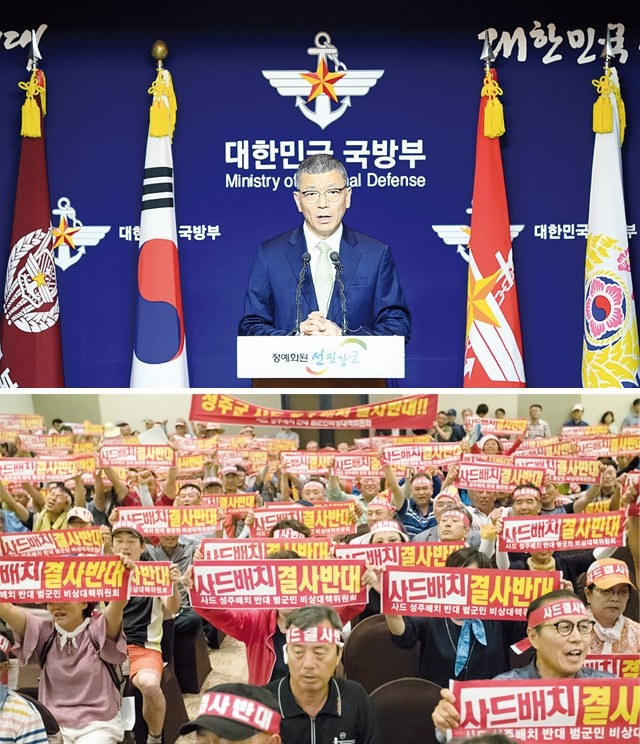 류제승 국방부 국방정책실장이 13일 오후 서울 용산구 국방부 브리핑실에서 미국의 고고도 미사일방어체계(THAAD·사드)의 경북 성주 배치 선정 배경에 대해 설명을 하고 있다(왼쪽). 사드가 배치될 지역인 경북 성주군 주민들로 구성된 비상대책위원회 회원들이 13일 오후 서울 용산구 국방부 컨벤션 센터에서 사드배치 반대를 외치고 있다.