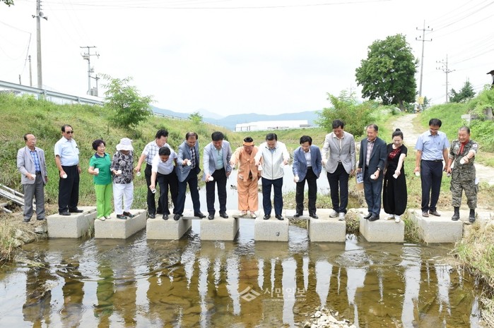 경기 양주 겨르메기 농촌건강장수마을은 14일 백석 홍죽천에서 이성호 양주시장(오른쪽에서 일곱 번째), 이희창 시의회부의장을 비롯한 시의원, 마을주민 등이 참석한 가운데 마을 하천을 살리기 위한 '자라 방류행사'를 진행했다.(사진제공=양주시청)