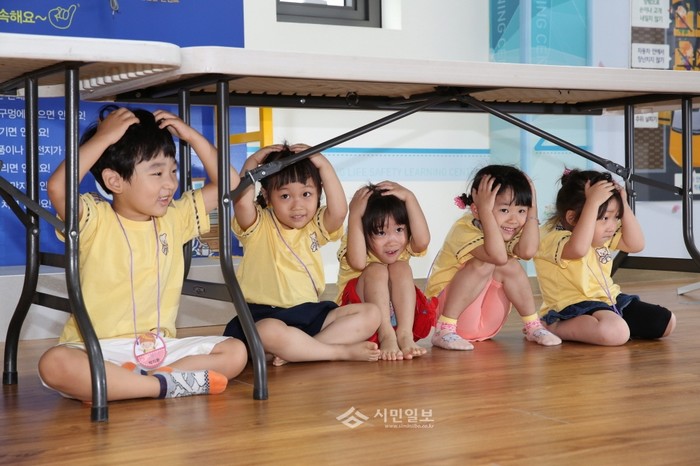 지난 13일 서울 성동구는 어린이집 원아들을 대상으로 성동생명안전배움터에서 지진대피 훈련을 실시했다. 사진은 어린이들이 지진 발생시 대피 방법에 대해 실습하고 있는 모습.(사진제공=성동구청)