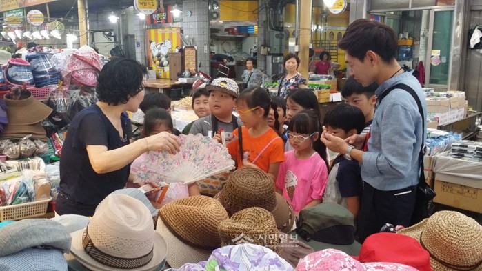 14일 세종시 조치원읍에 소재한 교동초등학교 어린이 200여명이 세종전통시장을 찾아 온누리 상품권을 이용해 물건을 직접 구매하는 등 장보기 체험을 하고 있다.(사진제공=세종시청)