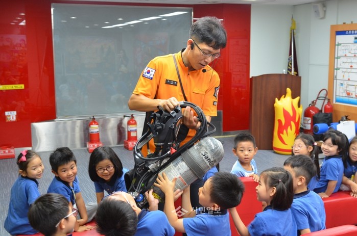 18일 서울 강남소방서는 신사어린이집 어린이 30여명을 대상으로 '소방안전체험교육'을 실시했다. 사진은 소방관이 어린이들에게 소방관들이 사용하는 개인보호장비에 대해 설명하는 모습.(사진제공=강남소방서)
