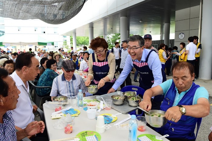 최근 경기 여주시노인복지관은 지역내 노인 1400여명을 대상으로 '삼계탕으로 건강한 여름나기' 행사를 복지관 후문 주차장에서 성황리에 진행했다. 사진은 원경희 시장이 노인들에게 삼계탕을 대접하고 있는 모습.(사진제공=여주시청)