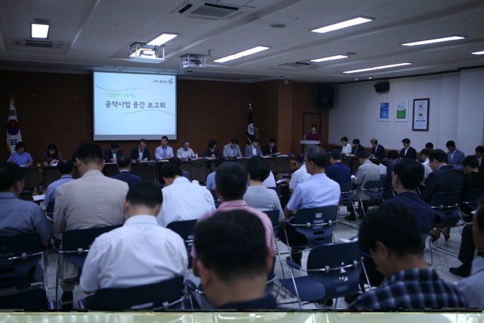 최근 이해식 서울 강동구청장은 구청 대강당에서 80여명의 직원들이 참석한 가운데 '공약사업 중간 보고회'를 개최하고 민선6기 공약 계획을 점검했다. 사진은 보고회가 진행되고 있는 모습.(사진제공=강동구청)