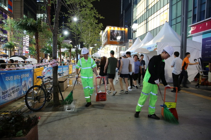 최근 신촌맥주축제 행사가 열린 서울 서대문구 신촌 연세로 차없는거리 일대를 늦은 시간까지 환경미화원들이 청소하고 있다. 구에 따르면 쓰레기 치우기 작업은 오전 4시까지 진행됐다. (사진제공=서대문구청)