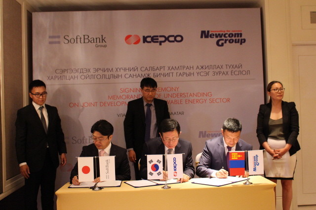 | ▲ (왼쪽부터) 미와 시게키 소프트뱅크 전략기획실장, 조환익 한전 사장, 엔크볼트 냠자브 뉴컴 CEO가 협약서에 서명을 하고 있다. | ||