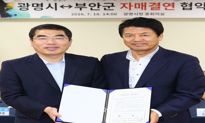 지난 18일 경기 광명시는 시청에서 관계자 등 50여명이 참석한 가운데 전북 부안군과 우호협력, 공동발전을 위한 자매결연 협약식을 개최했다. 사진은 양기대 시장(왼쪽)과 김종규 군수가 협약서를 들고 기념촬영하는 모습.(광명=류만옥 기자)