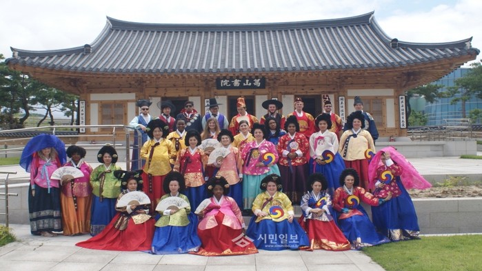 지난 17일 세종시가 한국관광공사 대전충남지사에서 추진하는 외국인 글로벌 축제 홍보단 관계자 30여명을 시로 초대해 팸투어를 실시했다. 사진은 외국인들이 궁중의상을 착용하고 기념촬영하는 모습.(사진제공=세종시청)