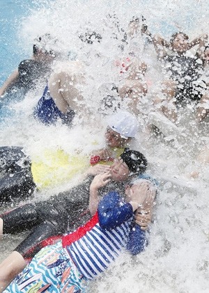 서울과 경기 일부 지역에 폭염주의보가 내린 19일 서울 뚝섬 한강공원수영장을 찾은 시민들이 물놀이하며 더위를 식히고 있다.