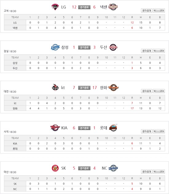 특히 한화 이글스는 kt wiz를 상대로 17-7 대승을 거뒀고 LG 트윈스도 10점 이상을 뽑아내며 막강한 활약을 펼쳤다.