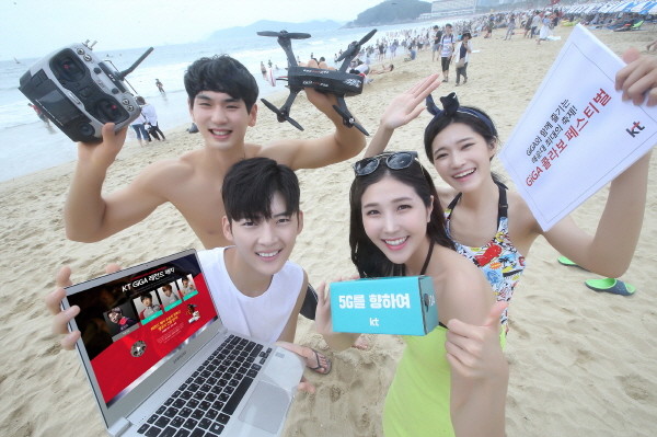 | ▲ KT의 모델들이 해운대에서 ‘GiGA 콜라보 페스티벌’ 개최를 홍보하고 있는 모습. | ||