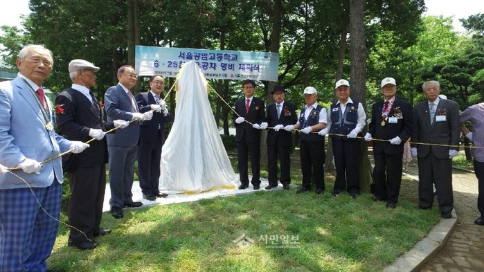 지난 19일 서울남부보훈지청은 서울공업고등학교에서 서울공고 출신 6.25참전유공자 201명의 이름을 새긴 명비 제막식을 개최했다. 사진은 윤종오 보훈지청장(오른쪽에서 여섯 번째)과 관계자들이 행사를 진행하는 모습.(사진제공=서울남부보훈지청)