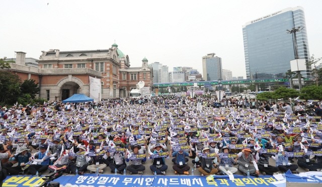 21일 오후 서울역광장에 모인 경북 성주 군민들이 사드(THAAD) 배치 반대 상경 집회를 벌이고 있다.