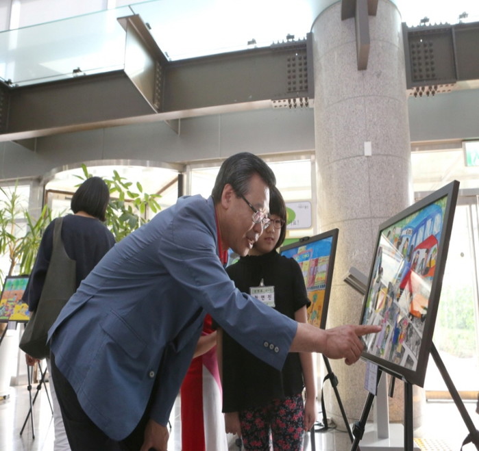 지난 19일 성장현 용산구청장이 '어린이 안전문화 작품 공모'에서 입상한 수상자 어린이와 함께 구청민원실에 열린 전시회에서 작품을 둘러보고 있다. (사진제공=용산구청)