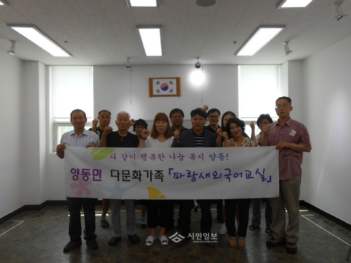 지난 20일 경기 양평군 양동면사무소와 다문화 어머니모임인 파랑새가족은 다문화 어머니들의 외국어 재능을 활용한 '파랑새외국어교실' 종강식을 진행했다. 사진은 관계자들이 기념촬영을 하는 모습.(사진제공=양평군청)