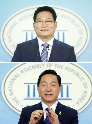 더불어민주당 송영길 의원이 24일 오전 국회 정론관에서 당 대표 출마기자회견을 하고 있다(위). 김상곤 전 혁신위원장도 24일 오전 국회 정론관에서 당 대표 출마기자회견을 하고 있다.