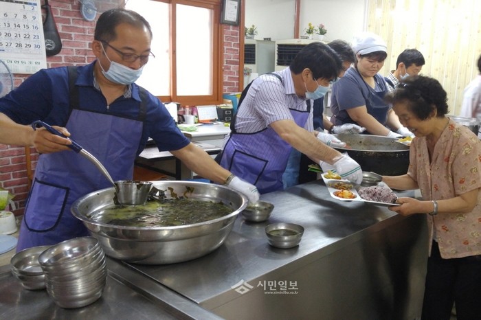 최근 경기 안산시 단원구는 원곡 무료경로식당을 찾아 '사랑의 배식 봉사활동'을 전개했다. 사진은 권오달 구청장을 비롯한 관계자들이 노인들에게 배식하는 모습.(사진제공=단원구청)