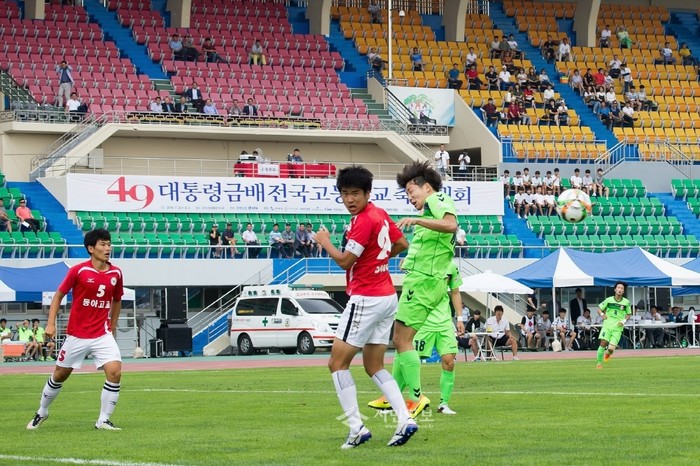 지난 22일 경북 구미시는 '제49회 대통령금배 전국고등학교 축구대회'를 개최했다. 사진은 개막 경기에서 구미 오상고등학교와 부산 동아고등학교 학생들이 공중볼을 경합하는 모습.(사진제공=구미시청)