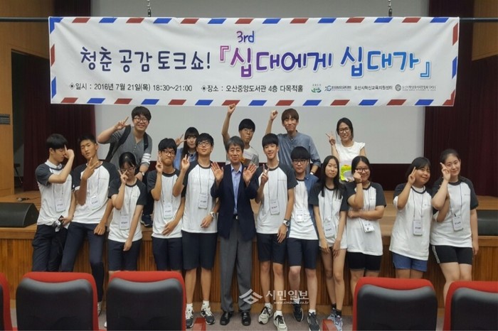 최근 경기 오산시는 중앙도서관 다목적홀에서 시 중고생 170여명이 참석한 가운데 오산학생동아리연합회가 기획한 청춘 공감 토크쇼 '십대에게 십대가'를 개최했다. 사진은 관계자와 학생들이 기념촬하는 모습.(사진제공=오산시청)
