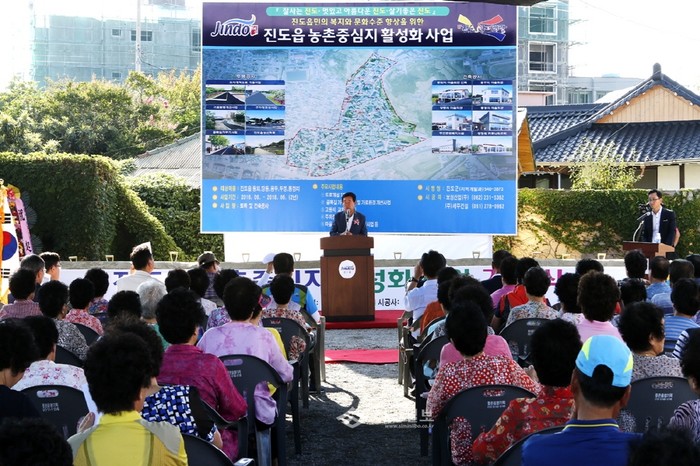 최근 전남 진도군은 진도읍 동외리 마을회관일원에서 이동진 군수, 추진위원회 및 주민 등 200여명이 참석한 가운데 진도읍 농촌중심지 활성화사업 기공식을 개최했다. 사진은 이 군수가 축사하는 모습.(사진제공=진도군청)