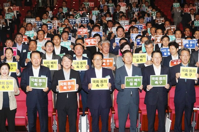 국민의당 박지원 비대위원장과 안철수 전 상임공동대표, 천정배 전 공동대표가 25일 오후 국회 의원회관에서 열린 지역위원장 임명장 수역식 및 연석회의에서 참석자들과 함께 사드배치 철회와 국회 동의를 촉구하고 있다.