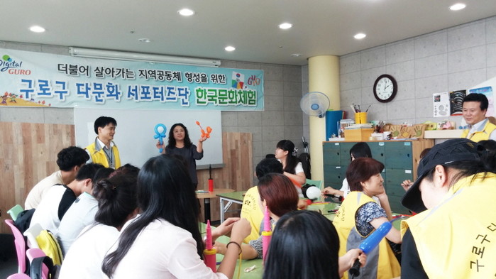 최근 구로구는 구로동에 소재한 화원종합사회복지관에서 다문화 서포터스단 8명의 재능기부로 중도입국 청소년 20명에게 한국문화 체험 프로그램을 제공했다. 사진은 서포터스 단원들이 프로그램을 진행하는 모습.(사진제공=구로구청)