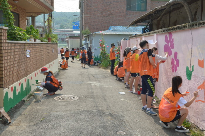 경기 사)동두천시종합자원봉사센터가 최근 ‘2016년 생명사랑 행복경기’ 환경분야 사업으로 실시한 광암동 26통 골목의 벽화 색칠 작업에 참여한 한마음가족봉사단, 동두천여중 교사·미술부학생 들이 칙칙한 벽에 꽃 그림을 그려넣고 있다.(사진제공=동두천시청)