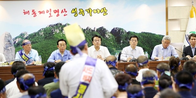 26일 오후 경북 성주군 성주군청을 찾은 새누리당 정진석 원내대표가 주민들과 간담회를 열고 질문을 받고 있다.