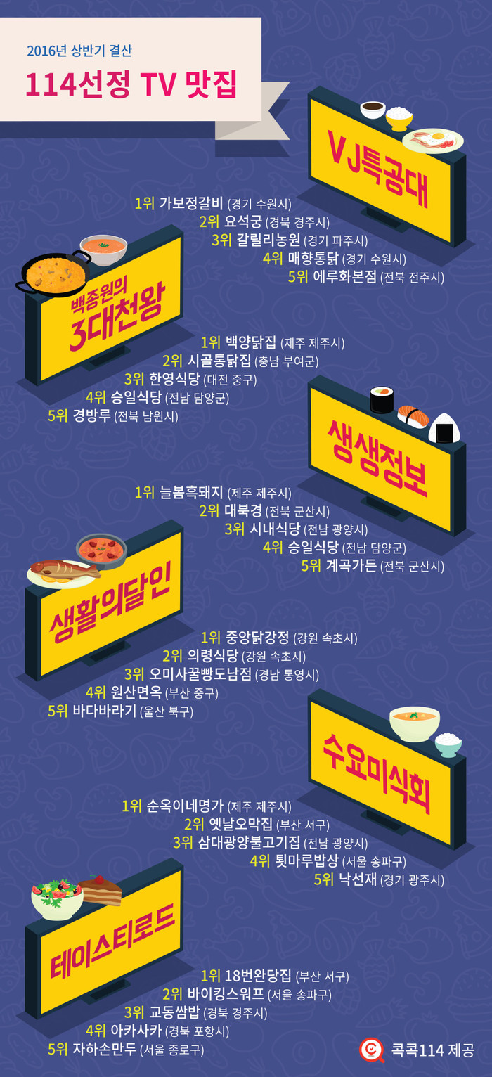 2위는 제주 ‘늘봄흑돼지(2865건, 생생정보)’, 3위는 제주 ‘백양닭집(1881건, 백종원의 3대 천왕)’ 4위는 부여 ‘시골통닭집’(1596건, 백종원의 3대 천왕), 5위는 제주 ‘순옥이네명가’(1183건, 수요미식회) 순이었다.