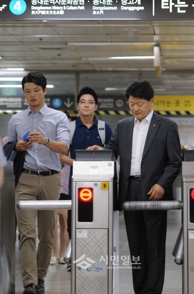 27일 최창식 서울 중구청장은 에너지 절약과 대기환경 개선을 위해 지정된 ‘대중교통 이용의 날’에 동참하기 위해 지하철을 이용해 구청사로 출근했다. 사진은 최 구청장(오른쪽)이 교통카드를 찍고 지하철 개찰구를 통과하는 모습.(사진제공=중구청)