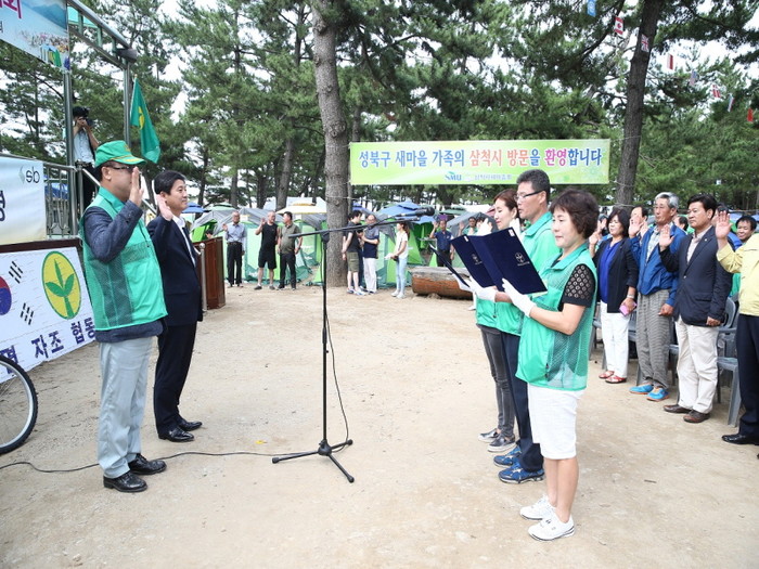 성북구의 자매도시인 강원도 삼척시에 소재한 성북구수련원에서 최근 열린 '2016년 성북구 새마을가족 한마음 하계수련대회'에서 입소식이 진행되고 있다. (사진제공=성북구청)
