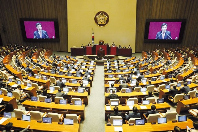 황교안 국무총리가 27일 오후 국회 본회의에서 정부의 추가경정예산안에 대한 정부의 시정연설을 하고 있다.