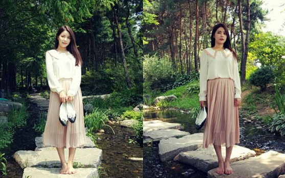사진 속 솔라는 하얀 블라우스에, 분홍 컬러의 스커트를 입고 청순한 미모를 뽐내고 있다. 맨발로 서있는 그의 모습이 눈길을 끈다.