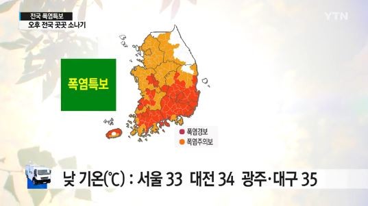 기상청에 따르면 중부지방은 폭염주의보가, 남부지방은 폭염경보가 발령됐다.