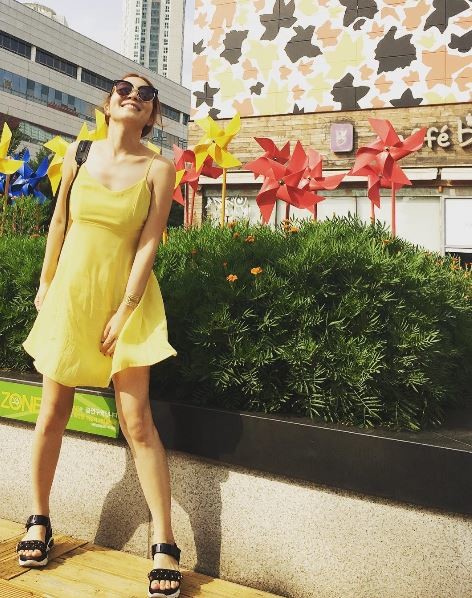 그는 밝은 미소와 함께 노란 원피스를 입고 있어 화사함을 자아낸다.