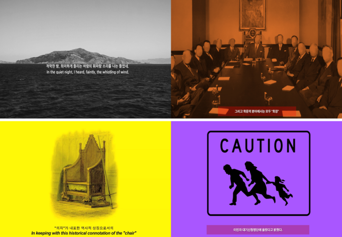 마지막으로 작업의 시발점이 되었던 영화 속 장면들과 오용석 작가가 직접 촬영한 장면들을 꼴라주 기법으로 연결해 마치 하나의 연속체처럼 연출했다.