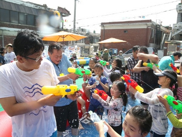최근 차성수 서울 금천구청장을 비롯한 구청 간부들이 독산4동 골목길 물놀이장을 방문해 어린이들과 물놀이를 즐기며 시원한 현장행정을 펼쳤다. 사진은 차 구청장(왼쪽에서 두 번째)이 어린이들과 물총싸움을 즐기는 모습.(사진제공=금천구청)