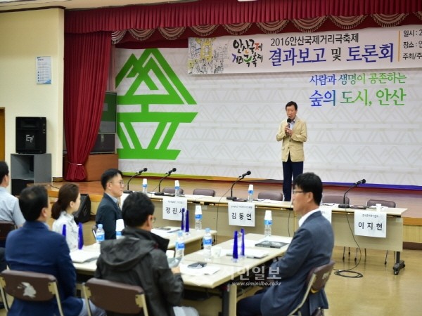 최근 경기 안산시는 시청 대회의실에서 축제 관계자 및 문화예술 인사, 시민들이 참석한 가운데 ‘2016 안산국제거리극축제 결과보고 및 토론회’를 개최했다. 사진은 제종길 시장이 인사말을 전하는 모습.(사진제공=안산시청)