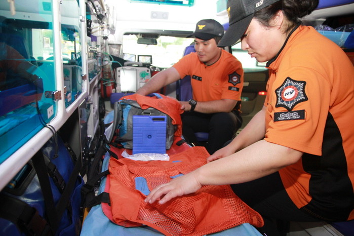 지난 2일 구로소방서는 지역내 119구급대 10개대를 대상으로 폭염 대응 구급장비 및 구급차 냉방기기 점검을 실시했다. 사진은 소방관이 얼음조끼 점검을 하는 모습.(사진제공=구로소방서)