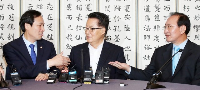 더불어민주당 우상호 원내대표(왼쪽)와 정의당 노회찬 원내대표(오른쪽)가 3일 오전 국회 귀빈식당에서 열린 야3당 원내대표 회동에서 국민의당 박지원 비상대책위워장 겸 원내대표에게 첫 발언을 권유하고 있다.