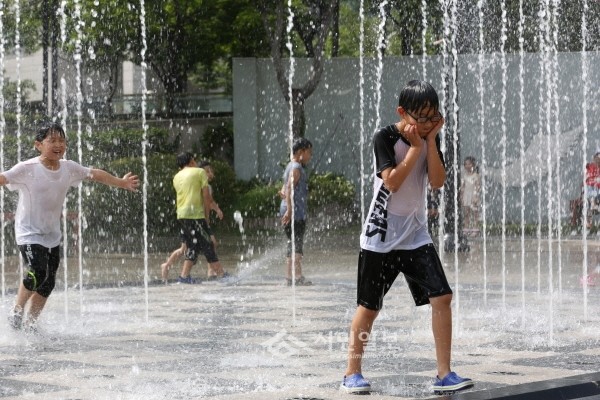 최근 서울 낮기온이 33도를 넘어서는 등 폭염이 계속된 가운데 서울 성동구 왕십리광장의 바닥분수에서 아이들이 시원한 물줄기를 맞으며 더위를 식히고 있다. (사진제공=성동구청)