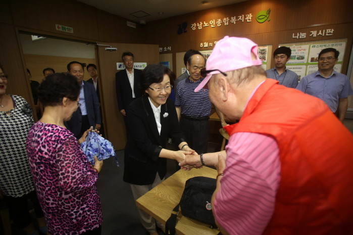 지난 3일 폭염 취약계층의 피해를 예방하기 위 무더위쉼터를 운영 중인 강남구 강남노인종합복지관을 방문한 신연희 구청장(가운데)이가 노인들과 악수를 하며 인사를 나누고 있다.(사진제공=강남구청)