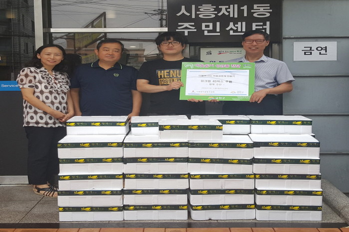 최근 금천구에 해산물 직판장을 운영하고 있는 왕게수산 관계자가 지역아동센터 3곳과 저소득 취약계층 10세대에 500만원 상당의 킹크랩 45박스를 전달했다. 사진은 전달식에 참여한 관계자들이 기념촬영을 하는 모습.(사진제공=금천구청)