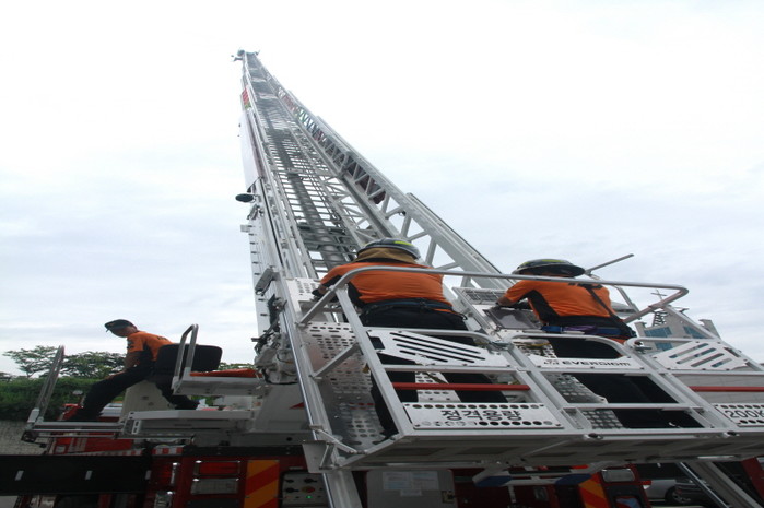 지난 3일 은평소방서는 특장 소방차에 대한 조작 숙달훈련과 점검을 병행 실시했다. 사진은 올해 새롭게 배치된 고가사다리차에서 소방관들이 훈련하는 모습.(사진제공=은평소방서)