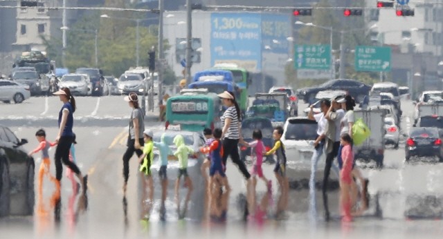 서울 지역에 폭염경보가 발령된 4일 오후 여의도의 한 대로 위로 지열로 인한 아지랑이가 피어오르고 있다.