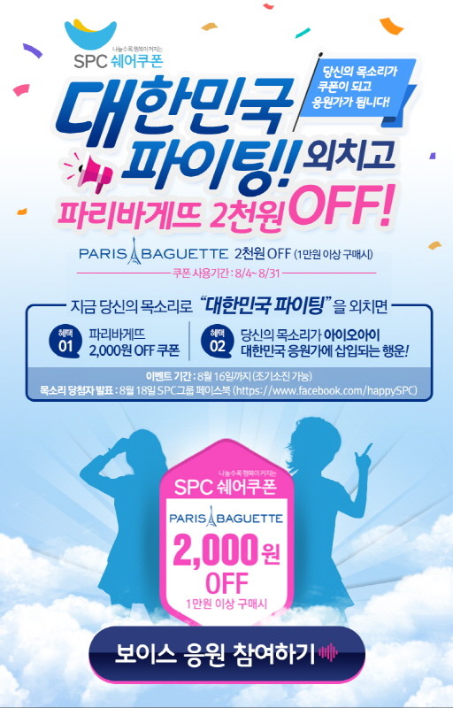 이 밖에도 프로모션 참여자들의 목소리 중 일부를 인기 걸그룹 아이오아이(I.O.I)의 대한민국 응원가에 삽입하는 이벤트도 진행한다. 목소리 당첨자는 오는 18일 SPC그룹 공식 페이스북 페이지에서 공개된다.